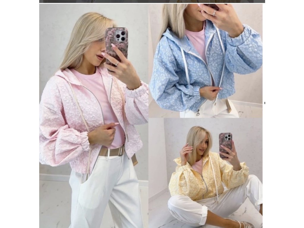 Stylová moderní bomber bundička s kapucí v trendy pastelových barvách. Jemný 3D vzor, díky kterému zaujme na první pohled. Balonové rukávy, pružné zakončení v pase i rukávů - hezky drží tvar.