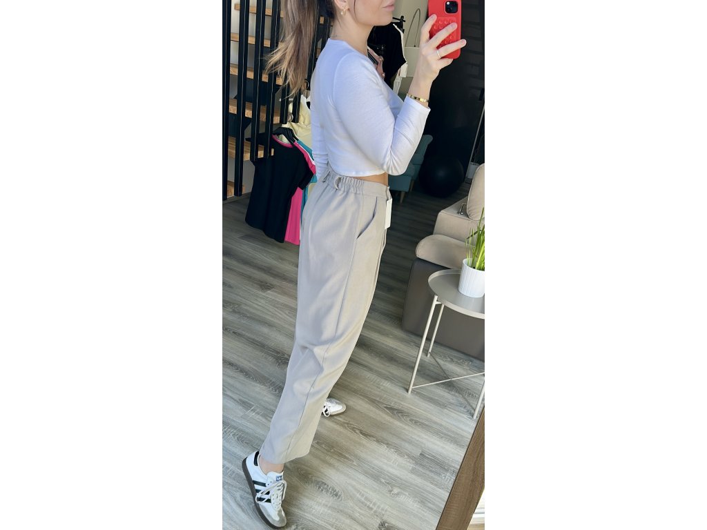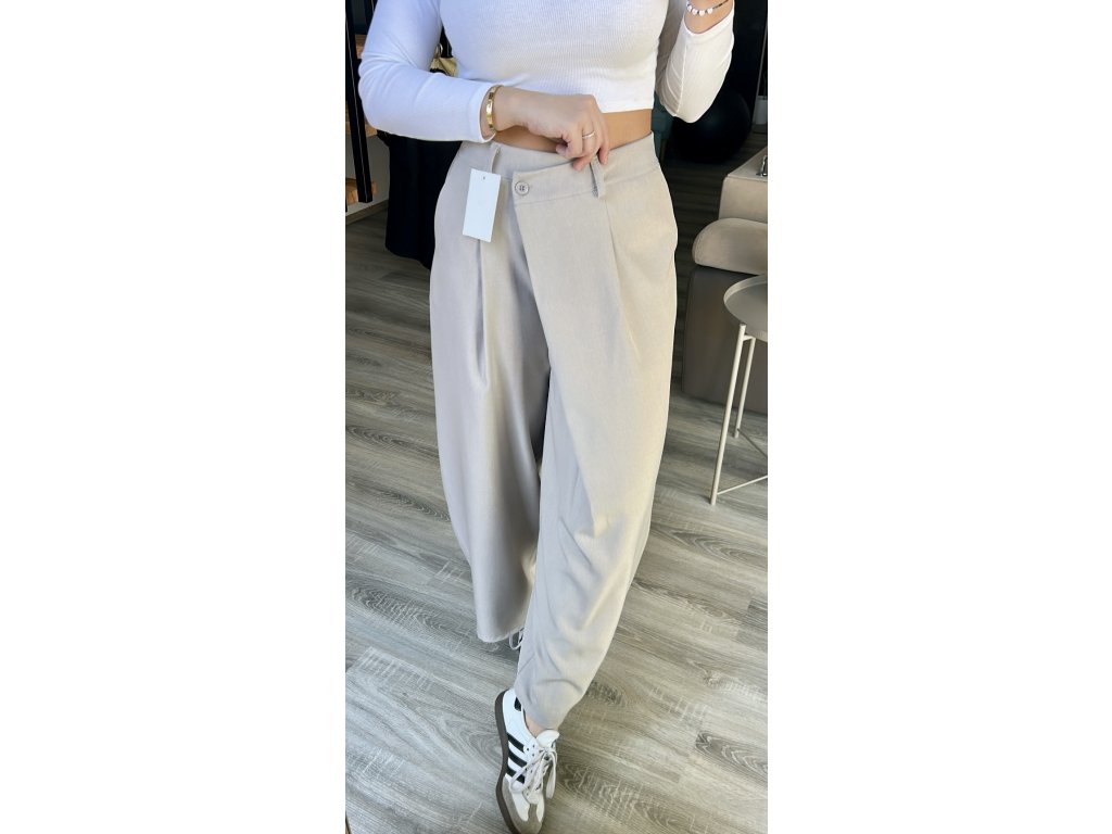 Kompromis mezi eleganci a sportovním stylem. Dokonale padnoucí kalhoty se zajímavým řešením zapínání zaujmou na první pohled, jsou však velmi pohodlné. Pružný pas vzadu do gumy, nohavice volnější lehce balónový střih. At v nich budete sedět v kanceláři nebo vyrazíte ven, budete se cítit skvěle.