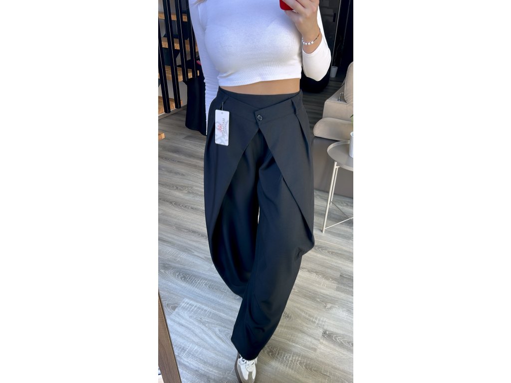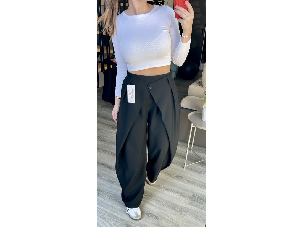 Kompromis mezi eleganci a sportovním stylem. Dokonale padnoucí kalhoty se zajímavým řešením nohavic zaujmou na první pohled, jsou však velmi pohodlné. Pružný pas vzadu do gumy, nohavice volnější lehce balónový střih. Ať v nich budete sedět v kanceláři nebo vyrazíte ven, budete se cítit skvěle.