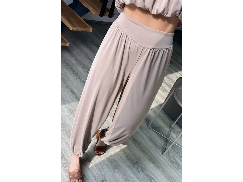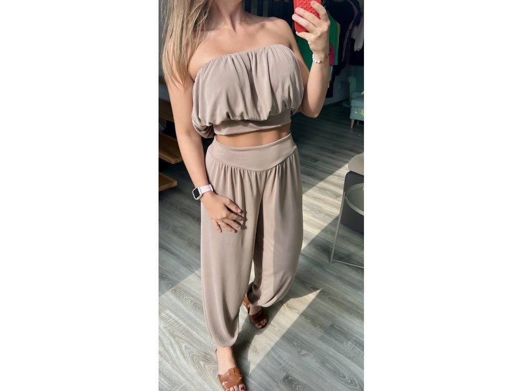 Nádherný komplet, z velice příjemného materiálu, který si zamilujete. Lehky, nemačkavý a příjemný na dotek. Kalhoty v pase do širší gumy, volnější nohavice zakončeny do gumy. Top je nařasený, nabíraný, neobepíná, na vrchu guma, zakončen širším elastickým pásem, který lze nechat vidět nebo schovat. Podprsenka bez ramínek je pod vršek možná.