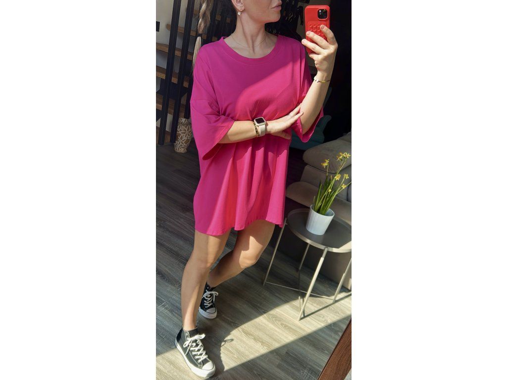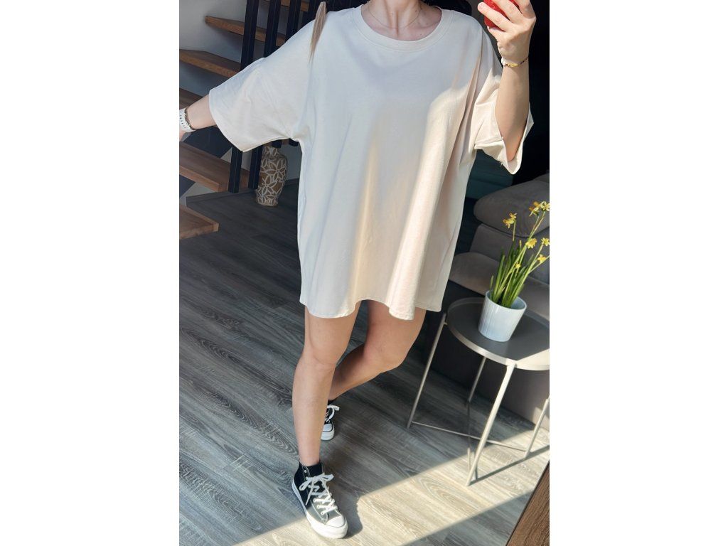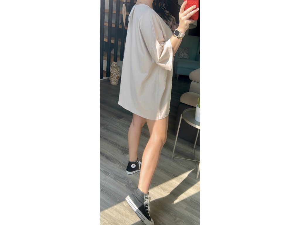 Maxi tričko, které lze nosit jako tričko nebo šaty. Spadené široké rukávy. Pohodlný kousek, který se hodí k legínám, kraťasům, ale i riflím.