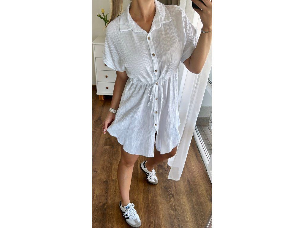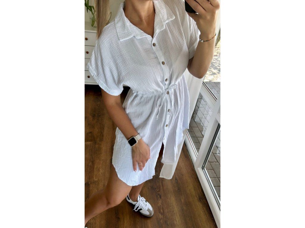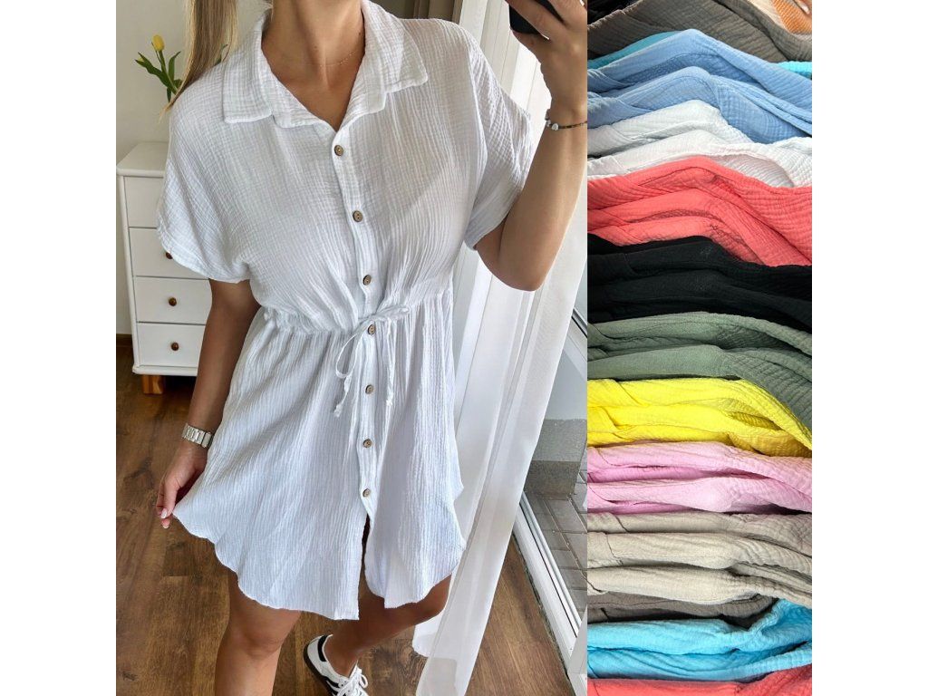 Velmi oblíbený bavlněný materiál v oblíbeném a pohodlném košilovém střihu. Šaty jsou po celé délce propínací, pod prsy vázání, krátký volný rukáv. Po bocích jsou vykrojené, což opticky prodlužuje nohy.