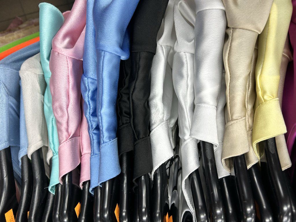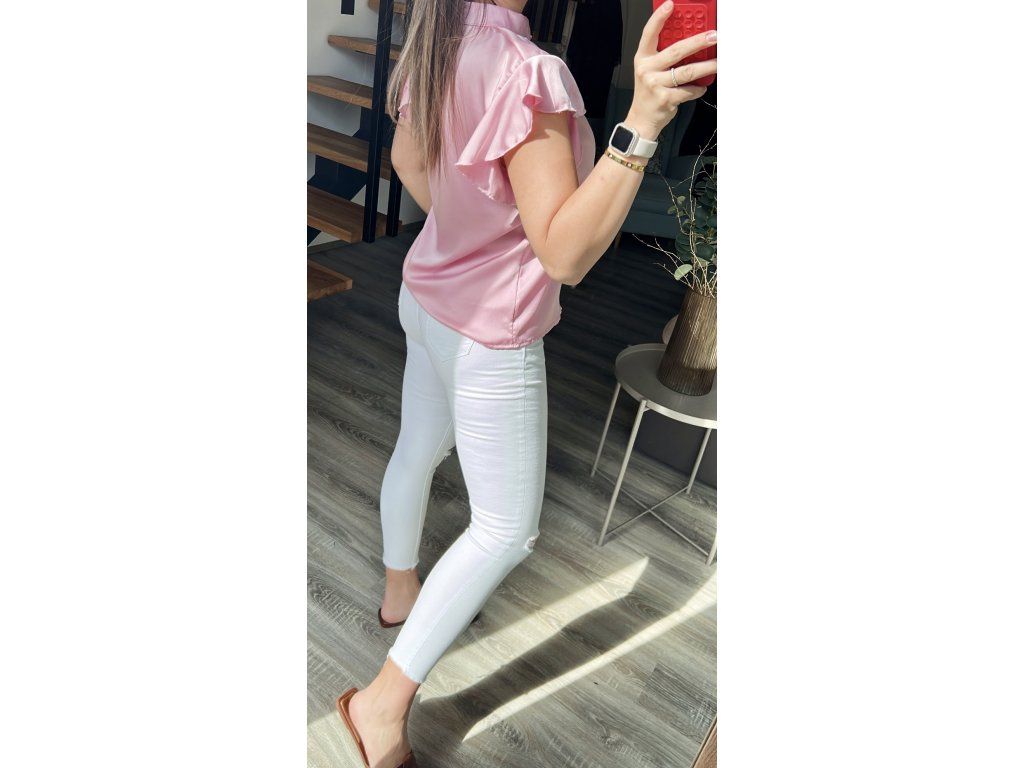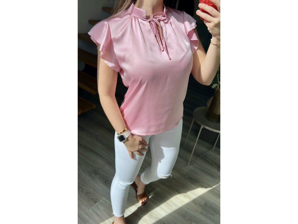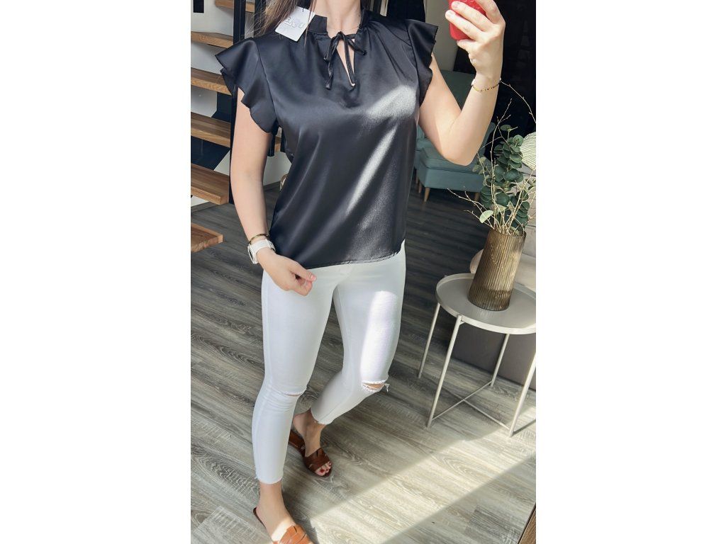 Saténová halenka bez rukávů s volánky, elegantnější kousek do Vašeho šatníku. K krku stojáček a vázanka.