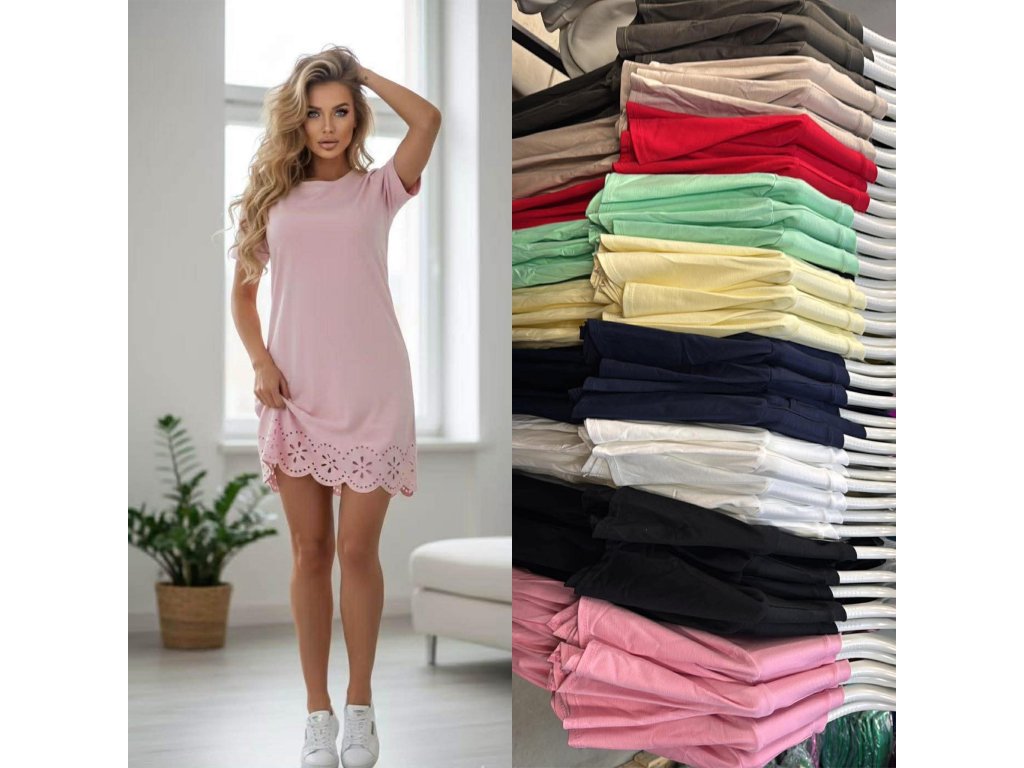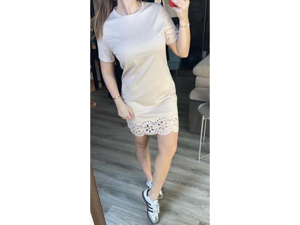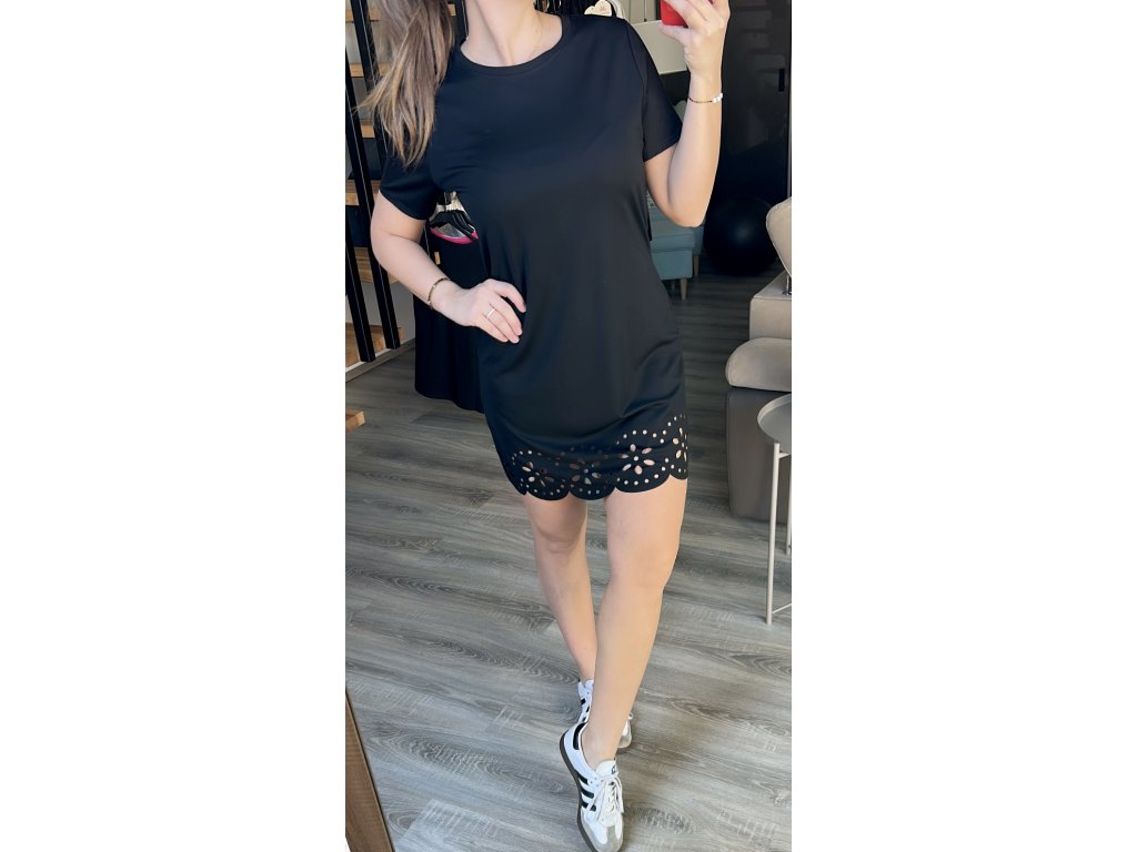 Jemné, vzdušné a nemačkavé....to jsou šaty tričkového rovného střihu s krátkým rukávem. Spodní část zdobená jemnými výkroji. Vhodné do velikosti M, menší L.