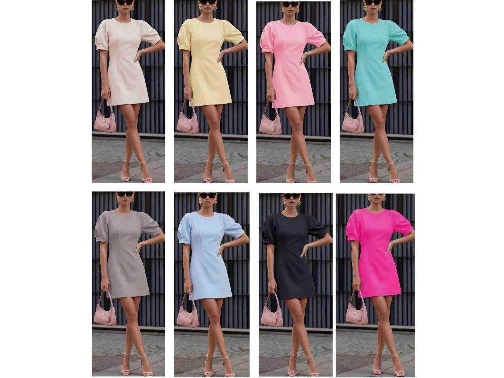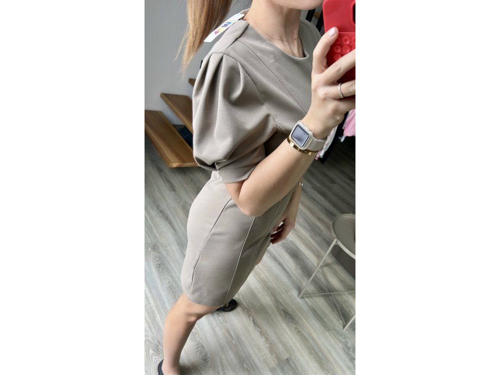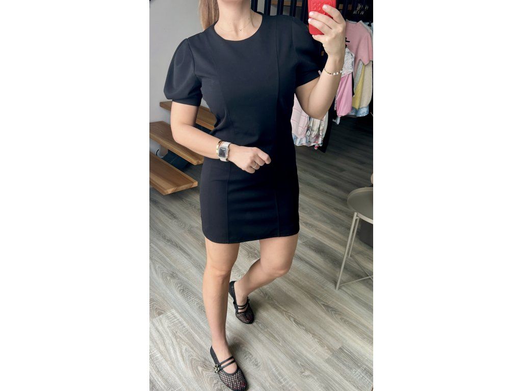 Šaty elegantnějšího vzhledu s nabíranými rukávy, vypasovaným pasem a vzadu zapínání na zip. Lehce elastické.