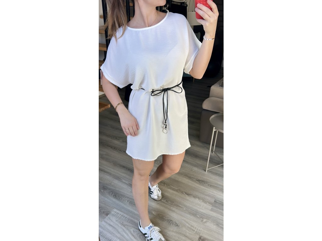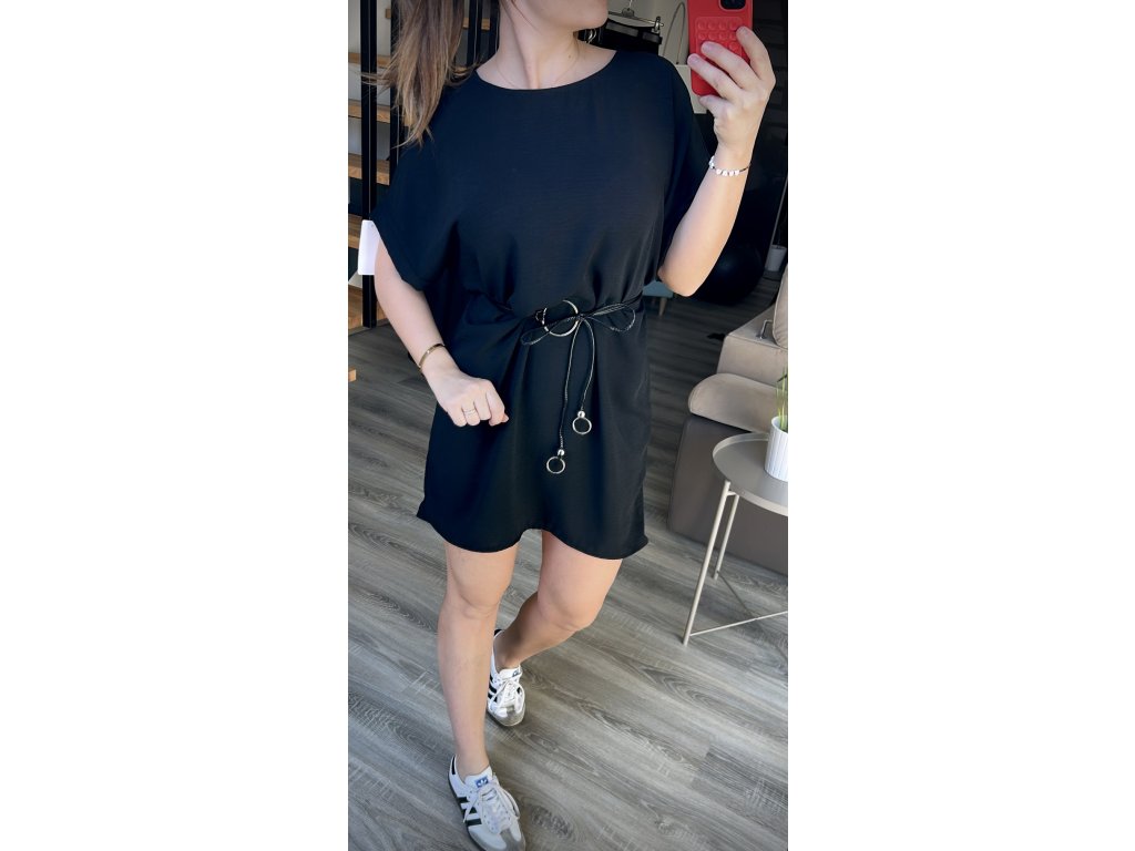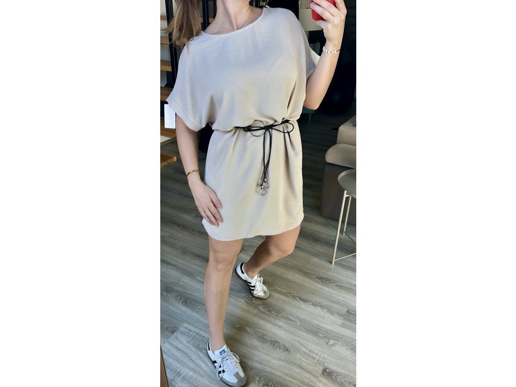 Vzdušné, nemačkavé šaty v oversize střihu. Lze nosit bez opasku (nejsou poutka) nebo je možné v pase uvázat koženkový opasek, který obyčejným šatům dodá šmrnc. Šaty vypadají hezky k teniskám, riflové bundičce i k sandálkům. Jednoduchý kousek, který se ve skříni neztratí. Vhodné do velikosti L/XL.