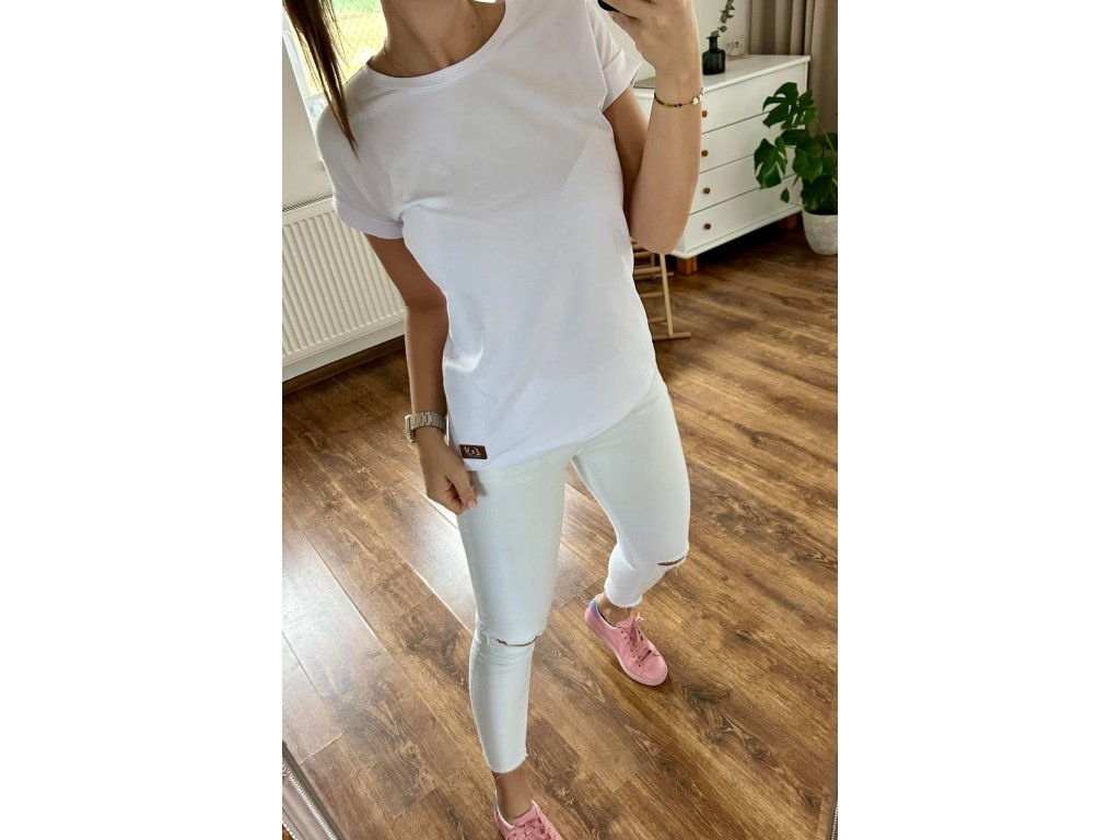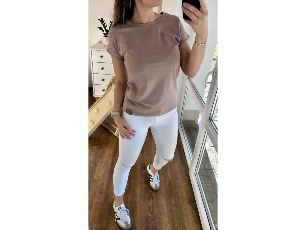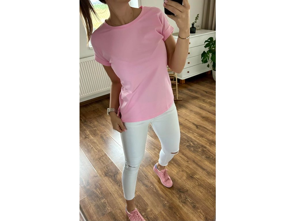 Bavlněné basic tričko je základem každého šatníku, která barva bude ta tvoje? Tričko je lehce volnějšího střihu s krátkým rukávem, ohrnuté lemy na rukávech.